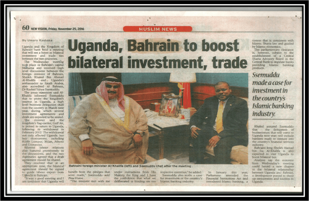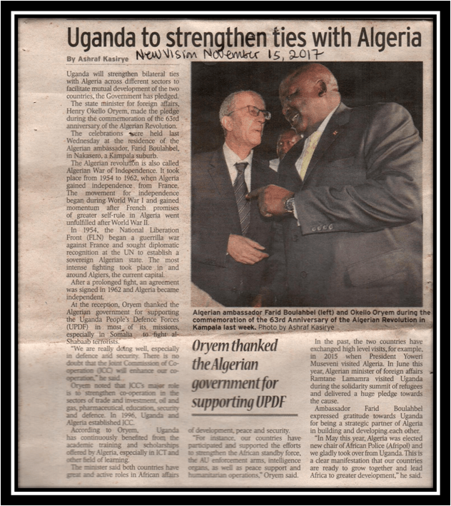 Ambassador Patrick MUGOYA, Permanent Secretary of the Ministry of Foreign Affairs of the Republic of Uganda yesterday received H.E. Farid BOULANBEL the Ambassador of the People’s Republic of Algeria to Uganda.